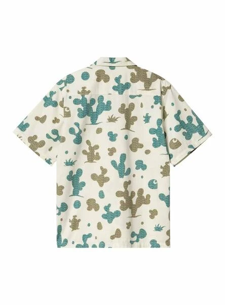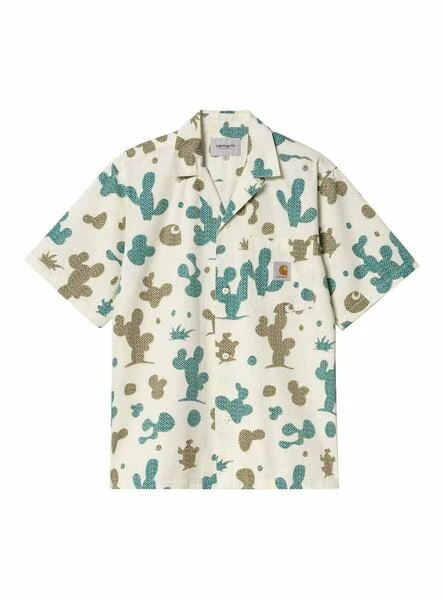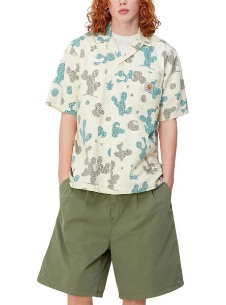 Chemise Carhartt. ModÚle Opus. Couleur beige. Imprimé avec des cactus en vert et bleu. Manches courtes. Ajustement ample. Coupe carrée. Col chemise. Poche poitrine avec patch de la marque. Fermeture avec des boutons.