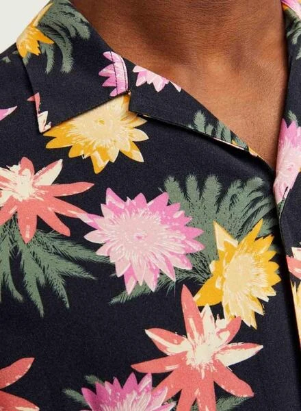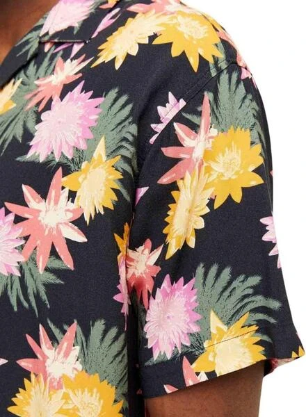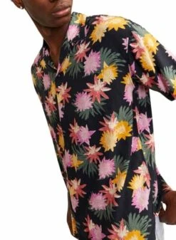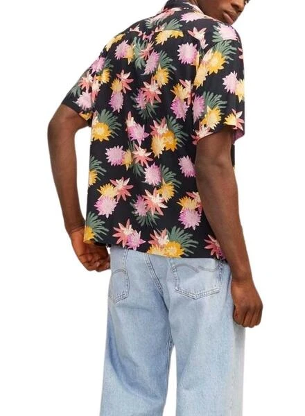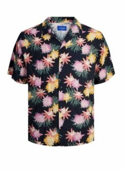 Chemise Jack and Jones. ModÚle Luke. Couleur bleu marine. Imprimé multicolore avec des fleurs. Col chemise. Fermeture à boutons. Manches courtes. Tissu léger.