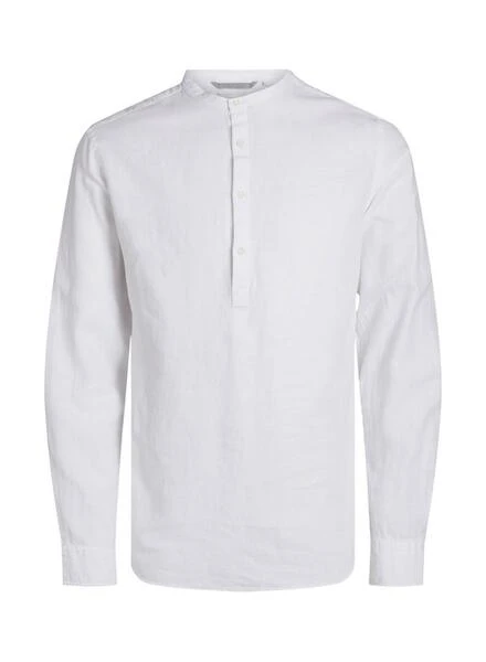 Chemise Jack and Jones. Modèle Mazie. Couleur blanche. Col rond. Style t-shirt. Fermeture à boutons jusqu’à la moitié de la poitrine. Manches longues. Coupe régulière.