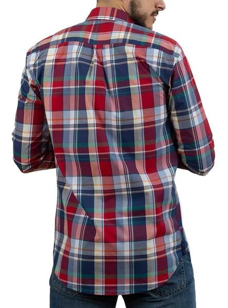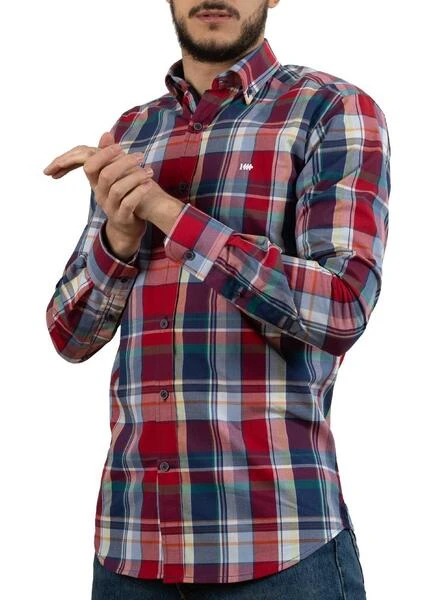 Chemise Klout. ModÚle Cosme. Imprimé à carreaux. Couleur rouge, bleu marine et blanc. Fermeture boutonnée. Logo blanc brodé sur la poitrine. Col boutonné. Poignets ajustés. Le mannequin porte une taille M.