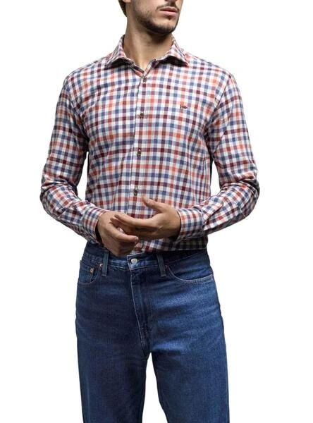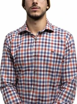 Chemise Klout pour man. Modèle Vichy Duo. Conception fabriquée en Espagne. Printed en carrés rouge, marron, blanc et marine. Logo brodé sur la poitrine marron.
