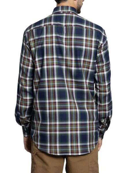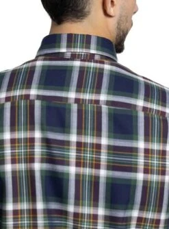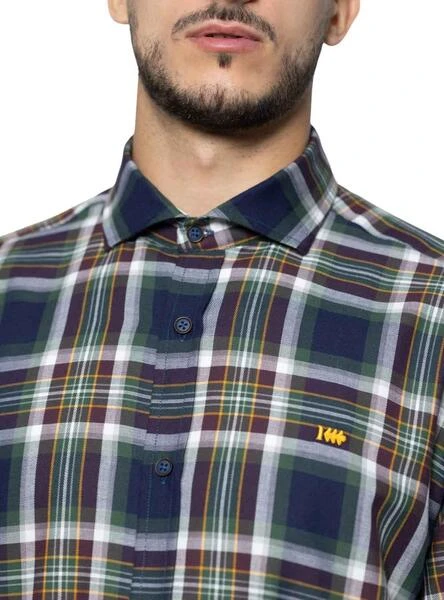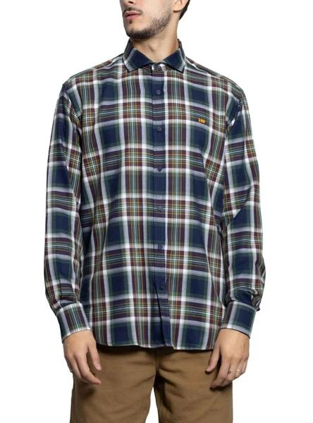 Chemise Klout. Modèle Leslie. Couleur bleu. Printed géométrique. Couleur est vert, moutarde et marron. Regular fit Ourlet arrondi. Le mannequin porte la taille L. Conçu et fabriqué en Espagne.