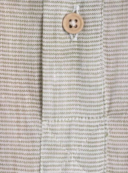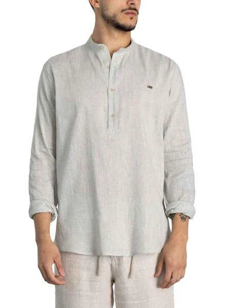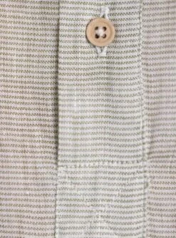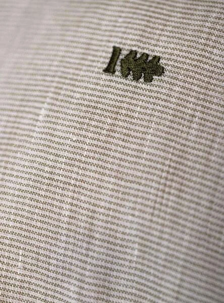 Chemise Klout. Modèle chemise. Couleur vert. Toile horizontale milRayures. Logo brodé sur la poitrine. Col mao avec boutons. Regular fit Le mannequin mesure 1,83 et porte une taille L.