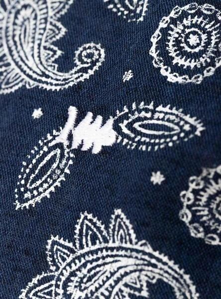 Chemise Klout. Imprimé cachemire et pois. Couleur bleu marine et blanc. Fermeture boutonnée. Ourlet arrondi. Regular fit. Poignets ajustés boutonnés. Logo blanc brodé sur la poitrine. Le mannequin porte une taille M.