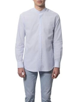 Chemise Klout. ModÚle Polera. Imprimé milRayures bleu et blanc. Manche longue. Fermeture par demi bande de boutons. Col Mao. Logo brodé sur la poitrine. Poignets boutonnés.