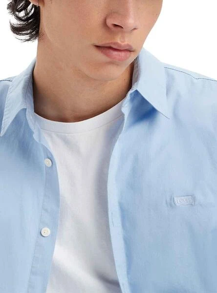 Chemise Levis. Couleur bleu. Manche longue. Coupe slim. Fermeture avant avec boutons. Logo sur la poitrine. Le mannequin porte la taille M.