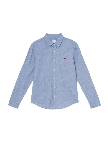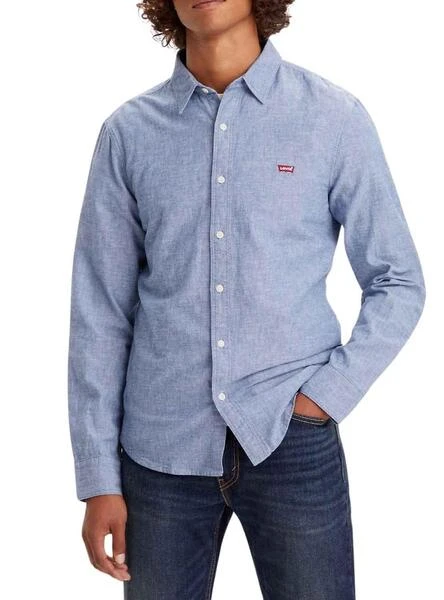 Chemise Levis. ModÚle Battery. Couleur bleu. Coupez le slim. Tissu marbré. Logo brodé sur la poitrine. Ourlet arrondi.