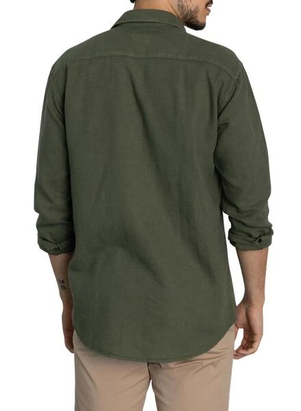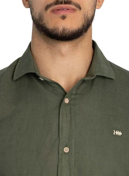 Chemise Klout. Couleur vert. Tissu lin et coton. Logo brodé sur la poitrine. Ancienne fermeture boutonnée. Col chemise sans bouton. Regular fit Le mannequin mesure 1,82 et porte une taille L.