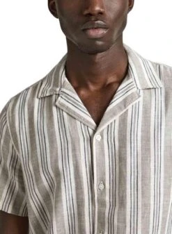 Chemise Pepe Jeans. Rayures verticales imprimĂ©es. Coupe rĂ©guliĂšre. Manches courtes. Col cubain. Ătiquette avec le logo de la marque sur la patte. Le modĂšle porte la taille M.