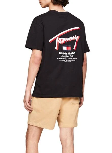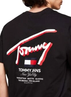 Chemise Tommy Jeans. Couleur noire. Encolure ronde. Manches courtes. Coupe régulière. Épaules tombantes. Détails distinctifs de la marque. Logo 3D sur la poitrine et le dos. Le modèle porte la taille M.