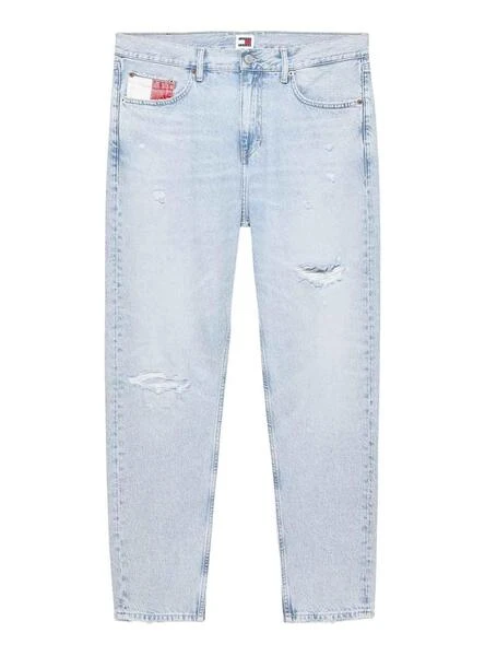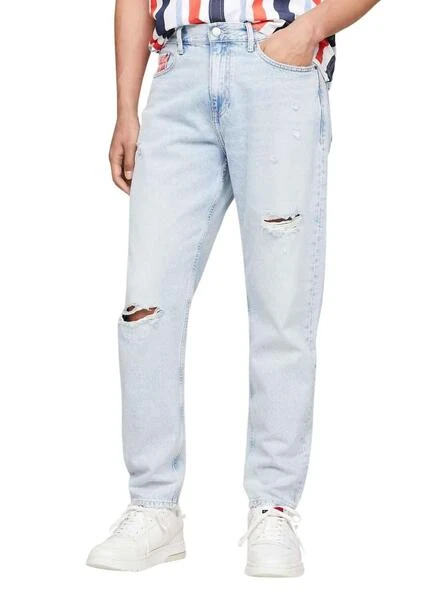 Jean Tommy Jeans. Modèle Isaac. Couleur bleue. 5 poches. Détails déchirés. Fermeture par bouton et fermeture éclair. Détails distinctifs de Tommy Jeans. Coupe large.