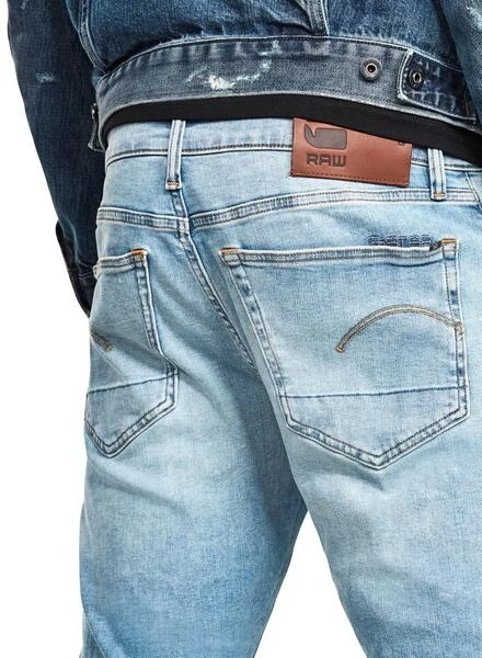 Jeans G Star. ModÚle 3301. Couleur bleu clair. Slim fit. Superstretch. Poches latérales. Poches arriÚre renforcées. Patch en cuir à la taille. Tir régulier. Fermeture boutonnée. Le mannequin porte une taille 3232.