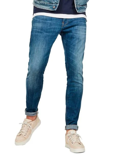 Jeans G-Star. Modèle Revend. Skinny. 5 poches Coutures épaisses dans les poches arrière. Renforts rivetés. Taille serrée. Coup court. Ajusté de la cuisse à la basse. Fermeture aboutonado. Le mannequin porte une taille 32.