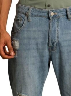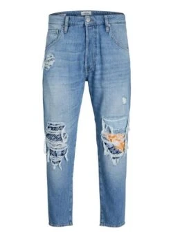 Pantalon Jack & Jones. Modèle Frank. Couleur bleu. 5 poches. Fermeture boutonnée et zippée. Détails cassés sur le partie avant. Regular fit.
