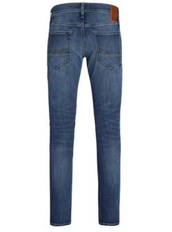 Pantalon Jeans Jack & Jones. Skinny. Modèle Glen. Denim sombre. Effet usé. Cinq poches. Patch de la marque sur la taille.