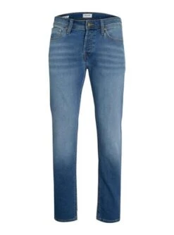 Pantalon jean Jack & Jones. Modèle Mike original. Couleur bleu. Fermeture boutonnée. Tir normal. Lavage usé. Tapeajustement rouge.