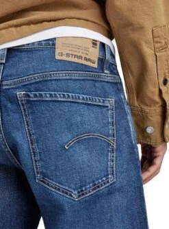 Pantalon Jeans G-Star. Modèle Mosa Straight. Couleur bleu moyen. Tissu denim en coton extensible. Plusieurs poches. Fermeture boutonnée et zippée. Détails distinctifs de la marque.