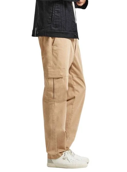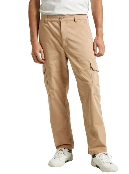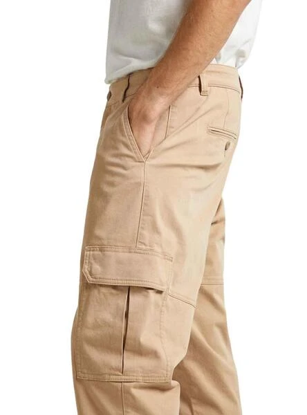 Pantalon Pepe Jeans. Couleur beige. Cargo. Tissu sergé extensible et flexible. Fit régulier. Rabat latéral du Poches. Fermeture éclair. BoutonniÚre au dos Poches. Etiquette logo sur la poche arriÚre. Le mannequin porte une taille 32.