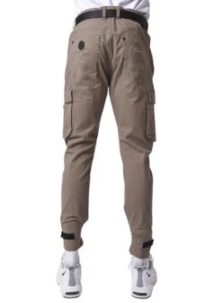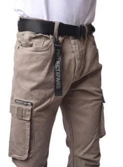 Pantalon Proyect x Paris. ModÚle Cargo. Couleur toastée. Coupe ajustée. Poches plaquées latérales. Ceinture incluse. Bas avec sangles ajustables. Porte-clés avec marque amovible.