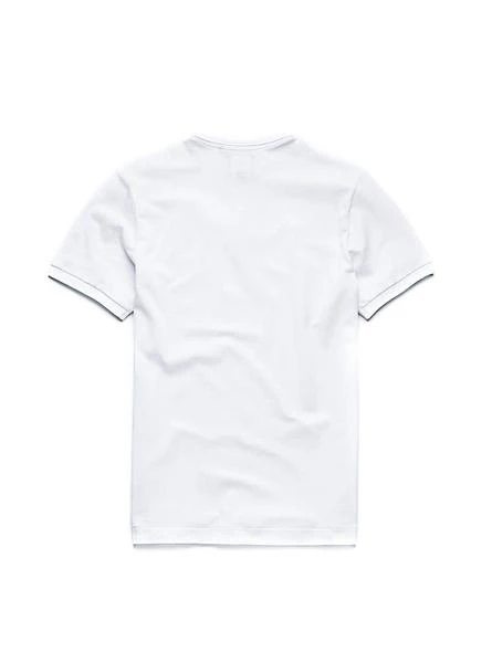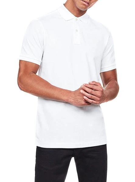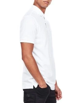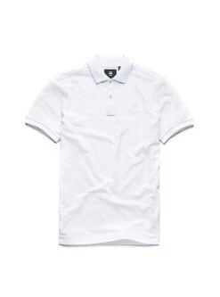 Polo G-Star. Modèle Dunda Couleur blanche. Manche courte. Collier avec deux boutons. Logo sur la poitrine. Slim fit. Le mannequin porte la taille M.