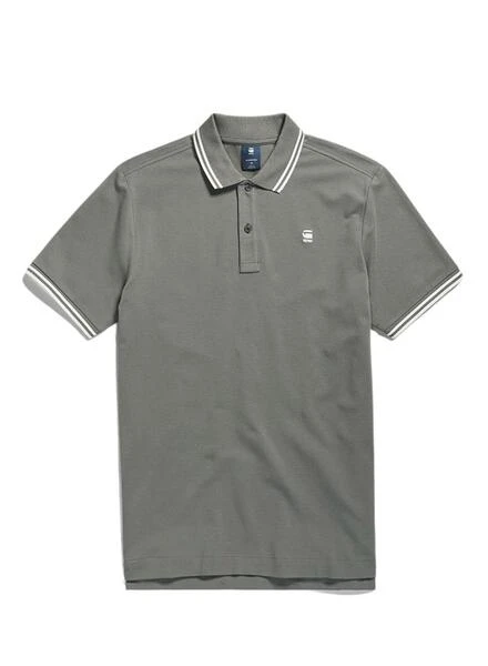 Polo G-Star. Couleur grise. Manches courtes côtelées. Col polo côtelé. Patte de boutonnage à deux boutons. Logo de la marque brodé sur la poitrine. Coupe ajustée. Fentes latérales. Ourlet droit. Détail de rayures sur le col et les manches.