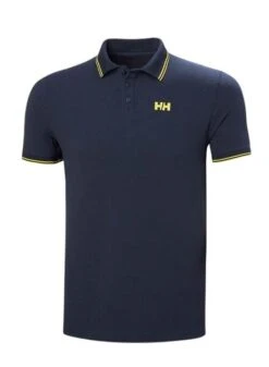 Chemise Helly Hansen. Modèle Kos. Couleur bleu marine. Col à boutons. Manches courtes. Bordure jaune. Logo imprimé sur la poitrine. Coupe ajustée.