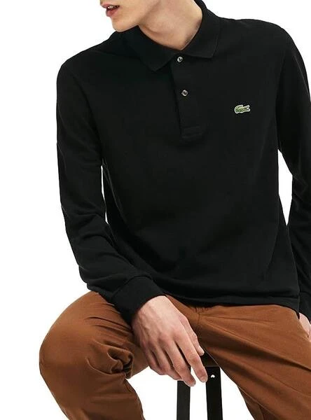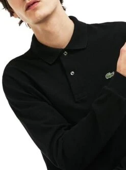 Polo Lacoste. Modèle L1312. Couleur noire. Manche longue. Col polo avec 2 boutons. Crocodile brodé sur la poitrine. Classic ajustement.