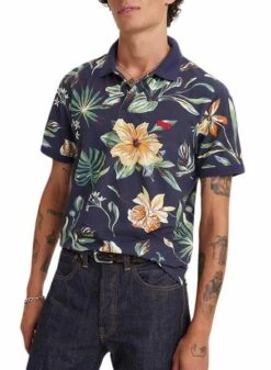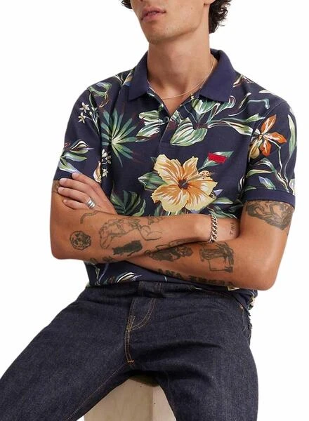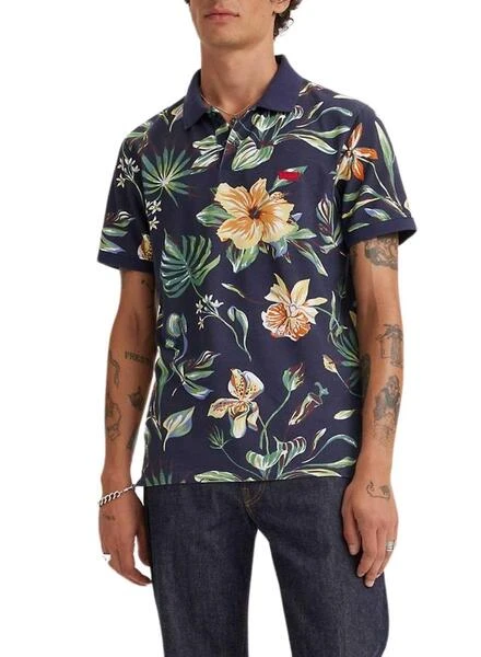 Polo Levis. Modèle Housemark. Couleur marine. Manches courtes. Col polo. Patte de boutonnage à 2 boutons. Imprimé fleuri. Coupe ajustée.