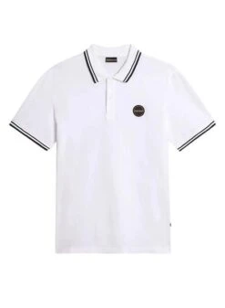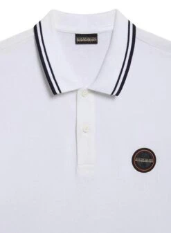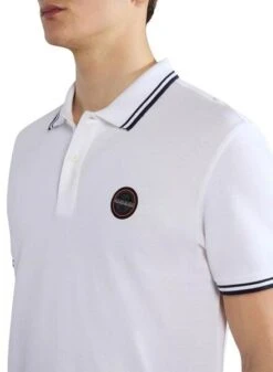 Polo à manches courtes Napapijri. Couleur blanche. Détails en contraste. ModÚle E-Macas. Fermeture à boutons. Patch sur la poitrine. Coupe réguliÚre. Le modÚle porte la taille L. Fabriqué en coton. Bordures cÎtelées.