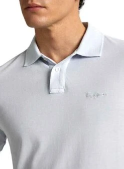 Polo Pepe Jeans. Modelo New Oliver. Couleur bleu clair. Col avec fermeture à boutons. Logo brodé assorti sur la poitrine. Manches courtes. Coupe régulière.