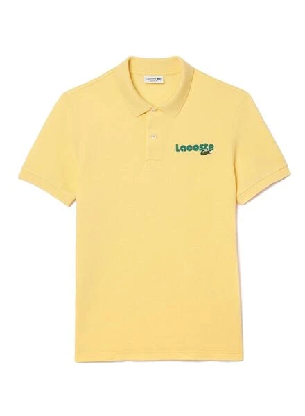 Polo Lacoste. Couleur jaune. Style rétro. Col avec deux boutons en nacre. Manches courtes. Coupe réguliÚre. Logo brodé avec marque imprimée sur la poitrine. Fabriqué en piqué écologique.