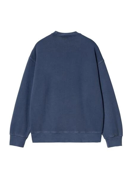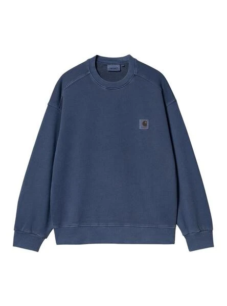 Sweatshirt Carhartt. Modèle Nelson. Couleur bleue. Effet lavé. Coutures contrastées. Patch de la marque sur la poitrine. Coupe ample. Extrémités côtelées.