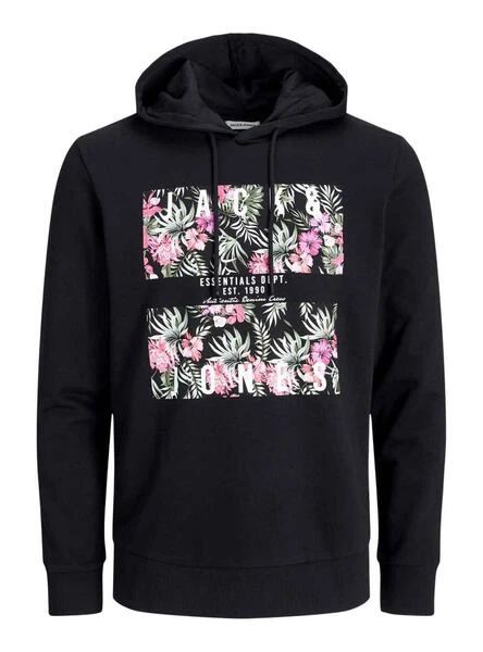 Sweat Jack & Jones. Modèle Chill Shape. Couleur noir. Manche longue. Capuche réglable avec des lacets. Regular fit Printed fleuri sur la poitrine. Poignets et ourlet élastiques.