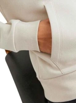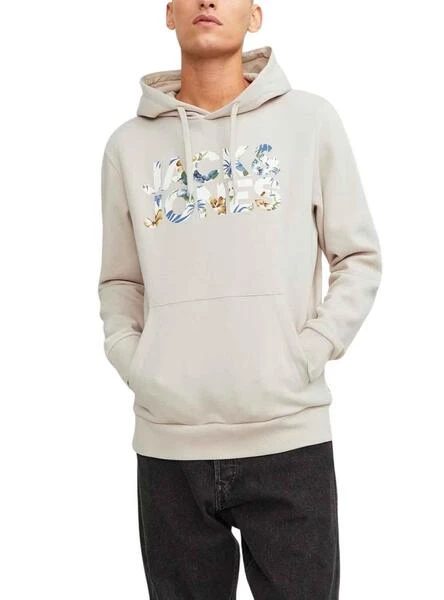 Sweat Jack & Jones. ModĂšle Jeff. Couleur beige. Capuche avec lacets. ExtrĂ©mitĂ©s Ă©lastiques. Kangourou Poche. Regular fit Logo imprimĂ© sur la poitrine d’un motif tropical.