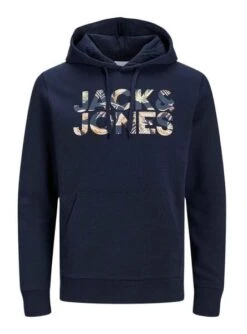 Sweat Jack & Jones. ModÚle Jeff. Couleur bleu marine. Capuche avec lacets. Extrémités élastiques. Kangourou Poche. Regular fit Logo avec imprimé tropical sur la poitrine.