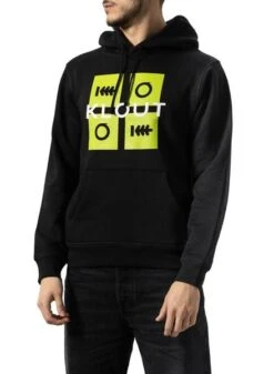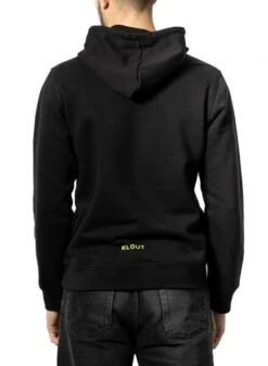 Sweat Klout. Couleur noire. Fabriqué avec des matériaux durables. Manche longue. Avec capuche. Poche kangourou. Détails en relief. Imprimé de couleur fluo sur la poitrine. Logo au dos. Le mannequin porte une taille M.