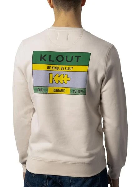 Sweat Klout. Modèle de table. Beige. Manches longues montées. Extrémités en maille côtelée. Logo en relief sur la poitrine. Impression sérigraphiée au dos avec couleurs. Demi-lune du même tissu sur la nuque.