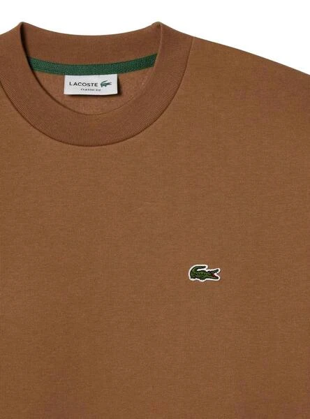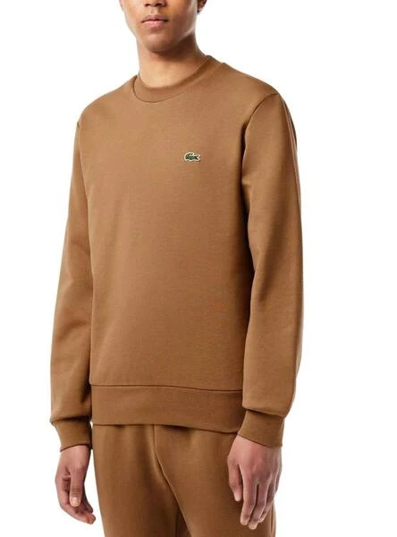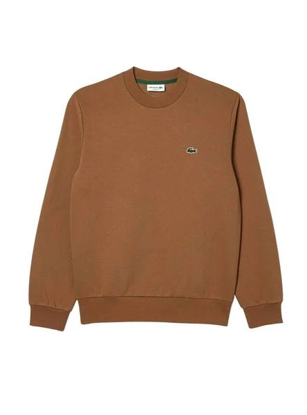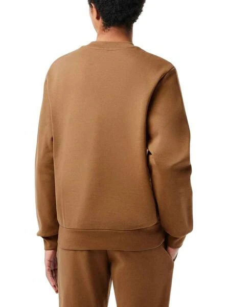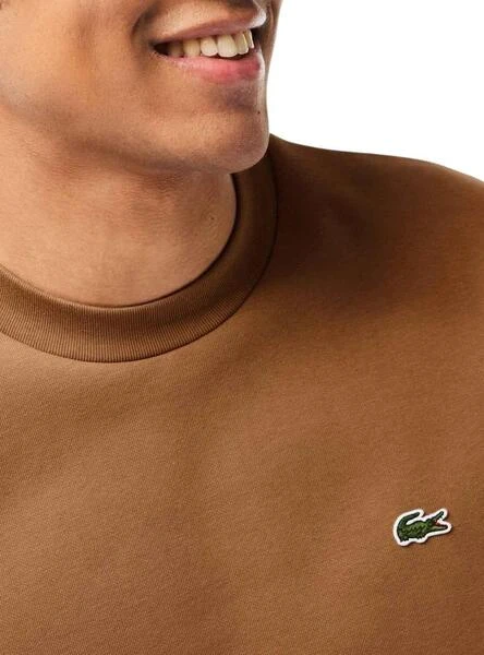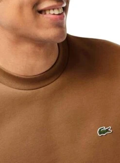 SweatLacoste. Modèle SH9608. Couleur marron. Manche longue. Col, poignets et ourlet. Logo sur la poitrine. col bas Classic convient. Tissu éponge en coton. Le mannequin porte une taille 4.