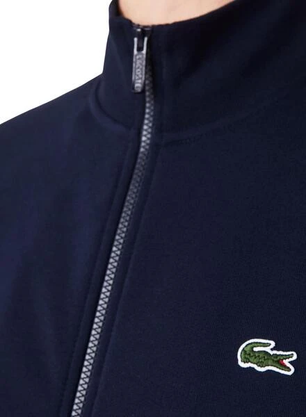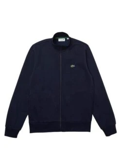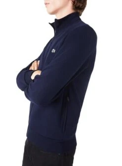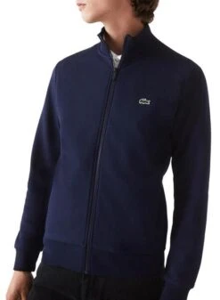 SweatLacoste. Couleur marine. Tissu brossé. Sans capuche. Fermeture éclair. Long cou. Crocodile brodé sur la poitrine. Extrémités élastiques. Deux poches latérales avec fermeture éclair. Regular fit