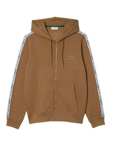 SweatLacoste. Modèle SH5065. Couleur marron. Avec capuche réglable avec cordons de serrage. Bandes latérales. Poche style kangourou. Poignets et ourlet élastiques. Classic convient. Broderie Logo. Peluche en coton. Fermeture éclair.