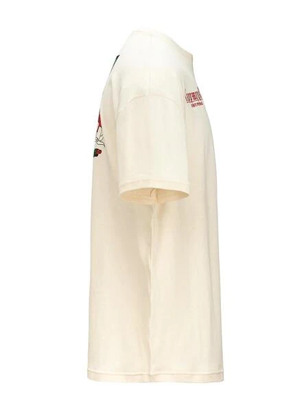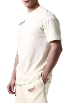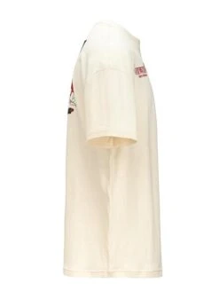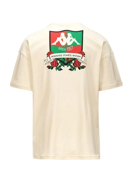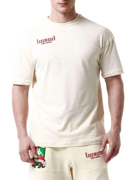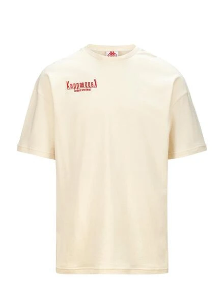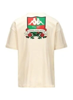 Camiseta Kappa. Modèle Lerice. Couleur beige. Manches courtes. Col rond. Broderie sur la poitrine. Impression graphique dans le dos.