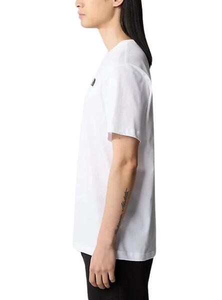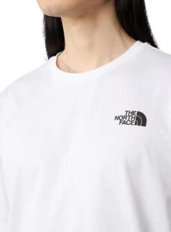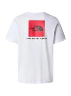 Maillot The North Face. Modèle Redbox. Couleur blanche. Logo imprimé sur la poitrine. Impression dans le dos en rouge. Coupe standard. Le modèle porte la taille M.