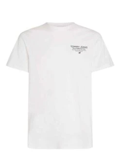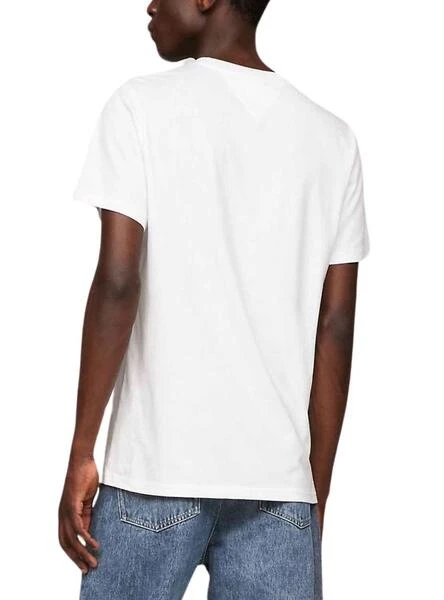T-Shirt Tommy Jeans. Coupez le slim. Tissu en coton. Col rond. Manche court. Couleur blanc. Logo ou Tommy Jeans sur la poitrine. Le mannequin porte la taille M.